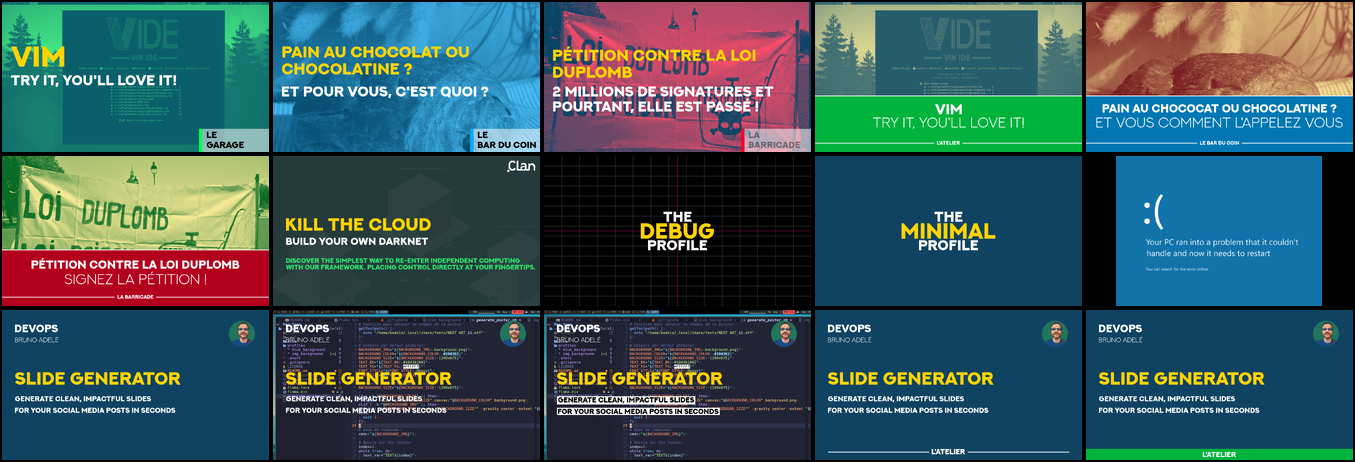 Slide generator est un générateur qui permet de créer des visuels graphiques pour agrémenter vos posts sur les réseaux sociaux. Grâce à des profils prédéfinis, vous pouvez rapidement créer des visuels cohérents avec la même charte graphique.
